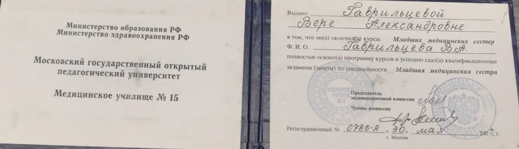 Удостоверение выдано Гаврильцевой Вере Александровне о том что она окончила курсы «Младших медицинских сестер. Гаарильцева Вера Александровна полностью освоила программу курсов и успешно сдала квалификационные экзамены по специальности Младшая медицинская сестра, 30.05.2002 г.