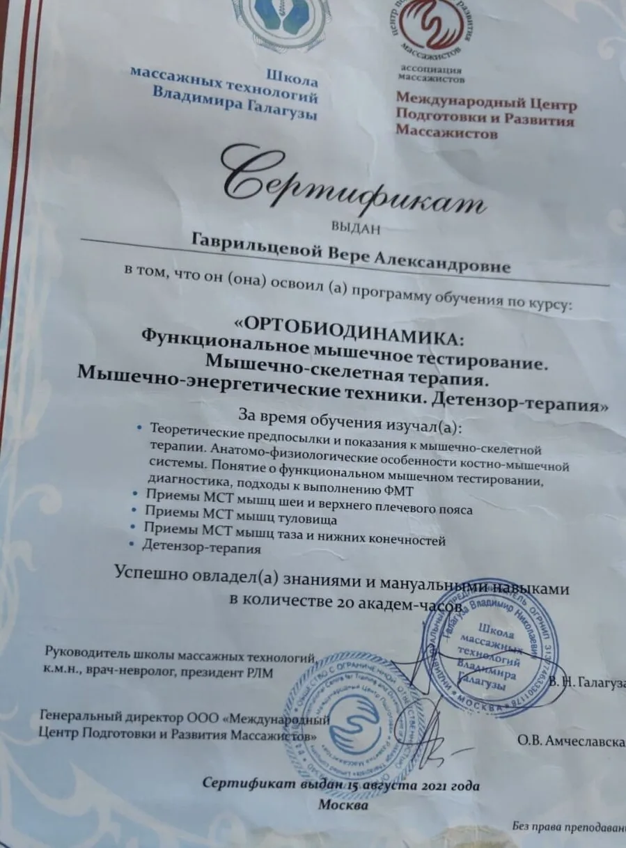 Сертификат выдан Гаврильцевой Вере Александровне в том, что она освоила программу обучения по курсу «Ортобиодинамика: функциональное мышечное тестирование. Мышечно-скелетная терапия. Мышечно-энергетические техники. Дентезор-терапия. Успешно овладела знаниями и мануальными навыками в количестве 20 академических часов.