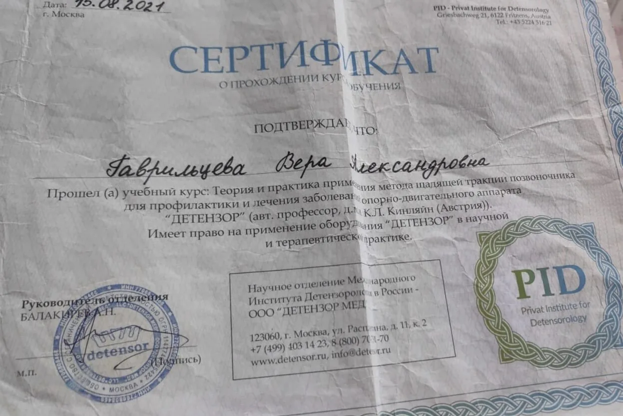 Сертификат подтверждает что Гаврильцева Вера Александровна Прошла обучение по курсу: «Теория и практика применения метода щадящей тракции позвоночника для профилактики и лечения заболеваний опорно-двигательного аппарата.