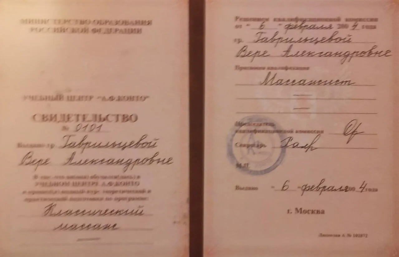 Свидетельство выдано Гаврильцевой Вере Александровне о том что прошла курсы: Классический массаж. Решением комиссии Гаврильцевой Вере Александровне присвоена квалификация «Массажист» выдано 6 февраля 2004 г.
