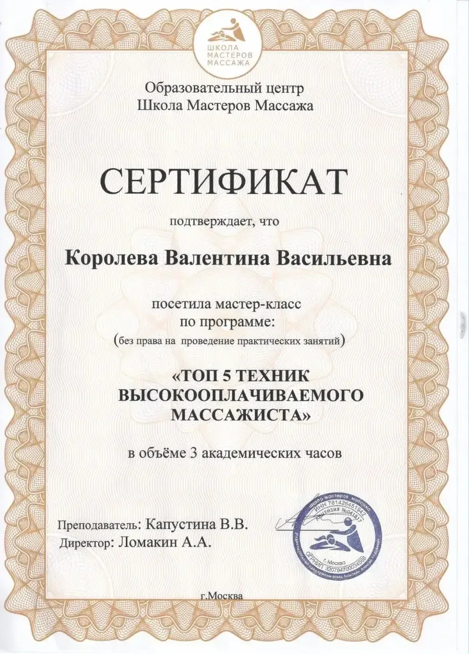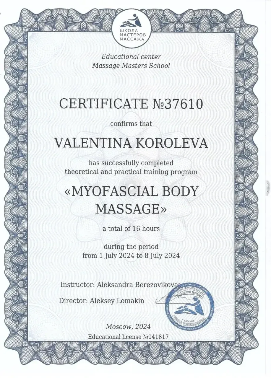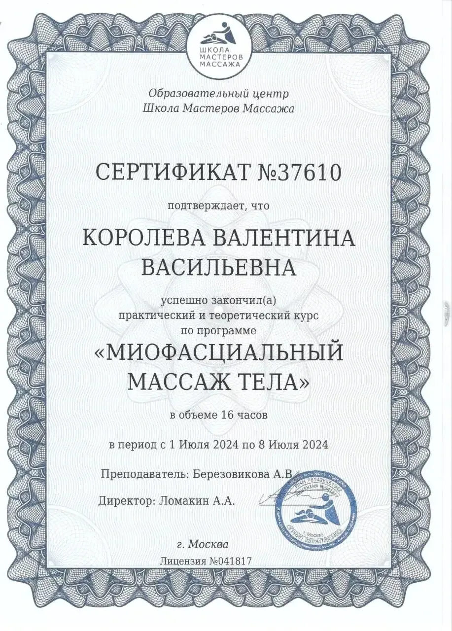 Сертификат подтверждает, что Королева Валентина Васильевна успешно закончила практический курс по программе «Миофасциальный массаж тела » в объеме 16 часов.