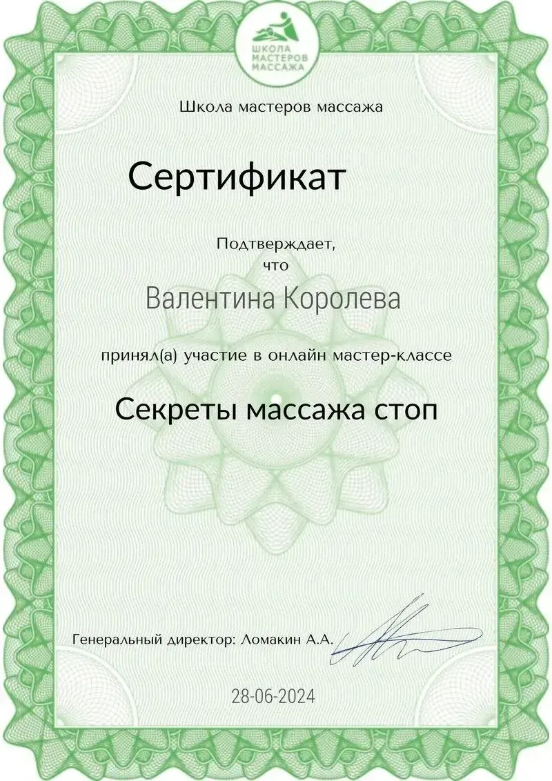 Сертификат подтверждает что Валентина Королева приняла участие в онлайн мастер-классе «Секреты массажа стоп»