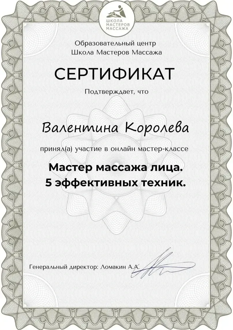 Сертификат подтверждает что Валентина Королева приняла участие в онлайн мастер-классе Мастер массажа лица. 5 эффективных техник.