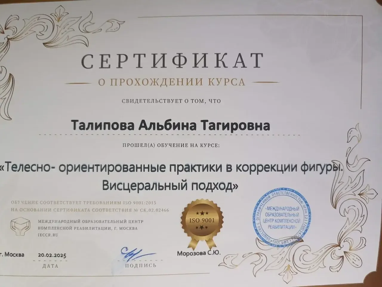 Сертификат о прохождении свидетельствует о том, что Талипова Альбина Тагировна Прошла обучение на курсе: «Телесно- ориентированные практики в коррекции фигуры. Висцеральный подход.
