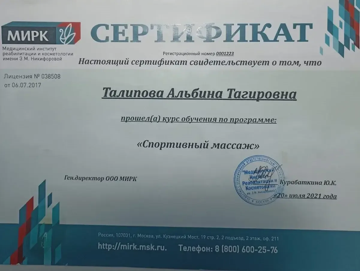 Настоящий сертификат свидетельствует о том, что Талипова Альбина Тагировна прошла курс обучения по программе: «Спортивный массаж» «20» июля 2021 года