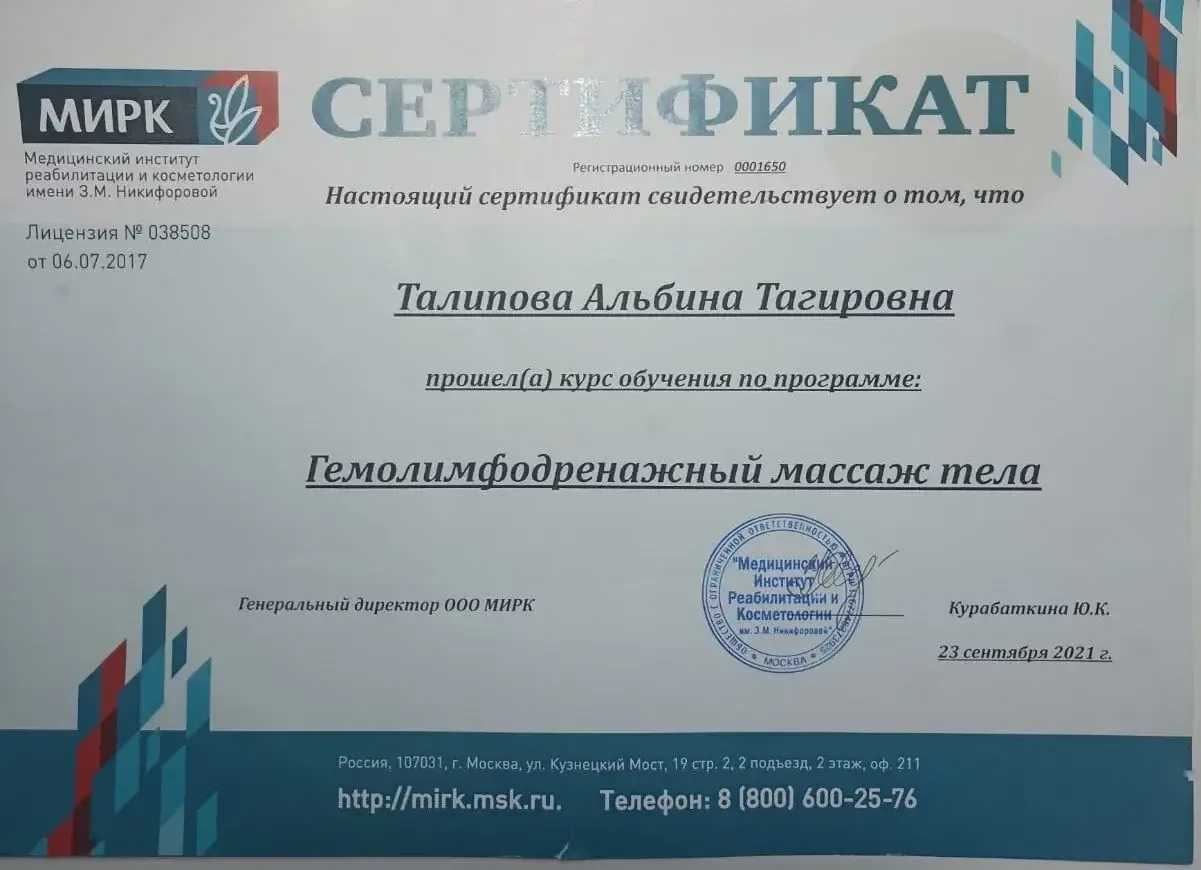 Медицинский институт реабилитации и косметологии имени 3.М. Никифоровой Настоящий сертификат свидетельствует о том, что Талипова Альбина Тагировна прошла курс обучения по программе: Гемолимфодренажный массаж