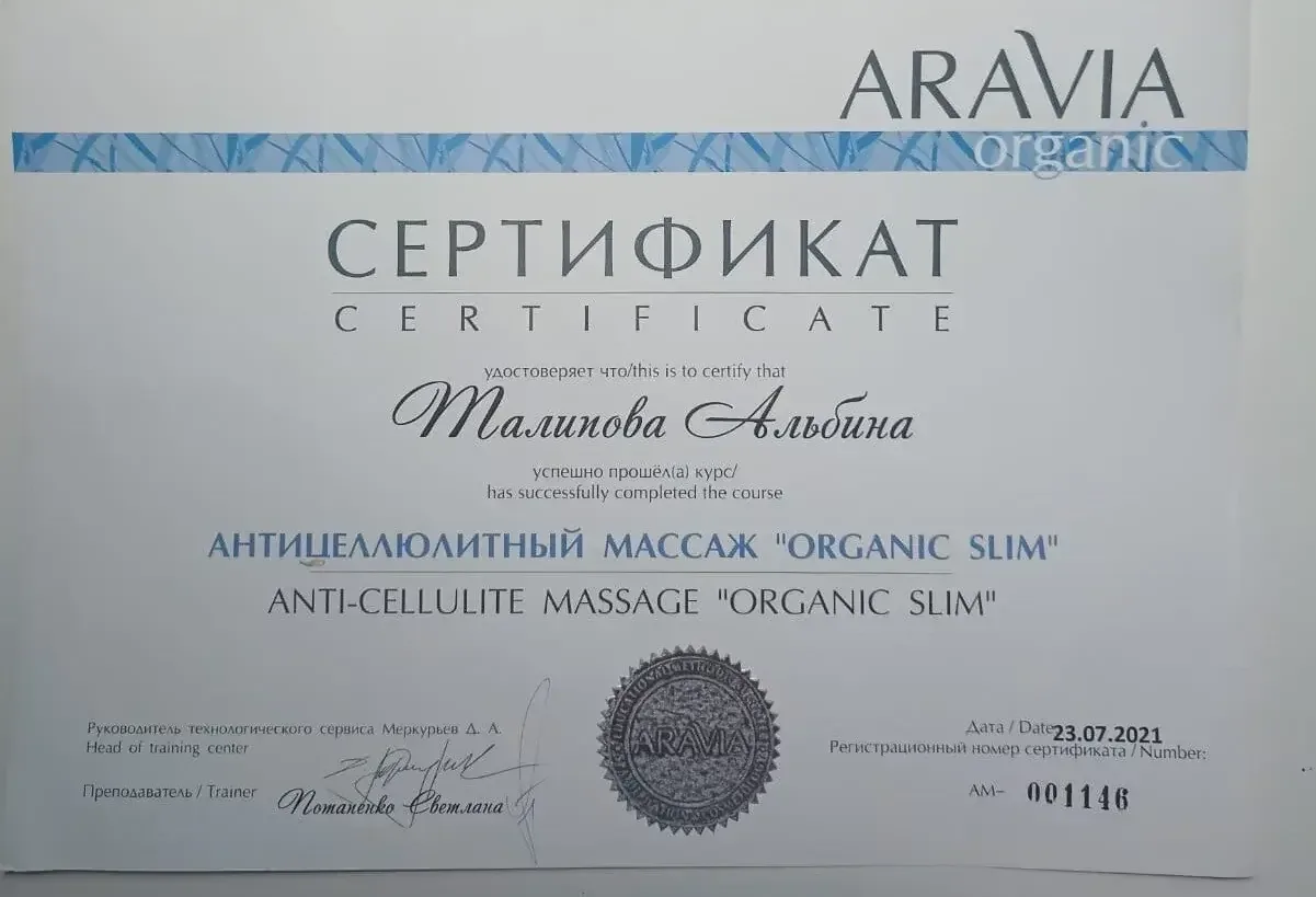 Сертификат удостоверяет что Талипова Альбина успешно прошла курс по программе АНТИЦЕЛЛЮЛИТНЫЙ МАССАЖ. Дата 23.07.2021
