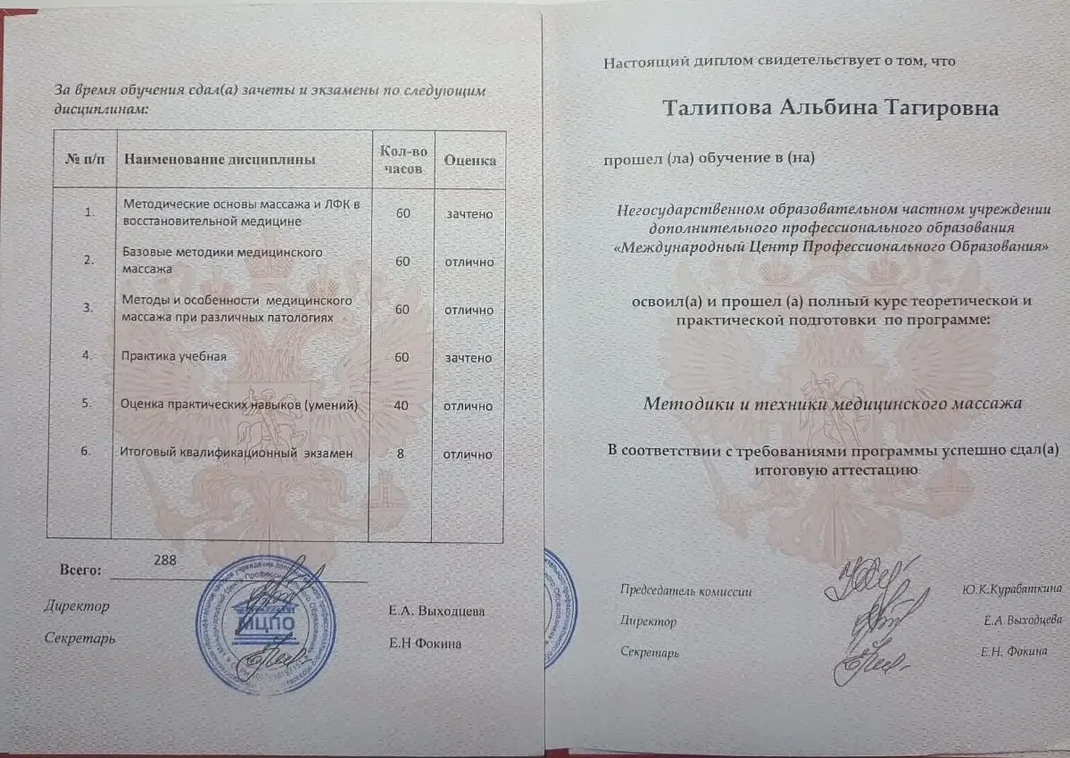 Настоящий диплом свидетельствует о том, что Талипова Альбина Тагировна прошла обучение Негосударственном образовательном частном учреждении дополнительного профессионального образования «Международный Центр Профессионального Образования» освоила и прошла полный курс теоретической и практической подготовки по программе: Методики и техники медицинского массажа В соответствии с требованиями программы успешно сдала итоговую аттестацию 288